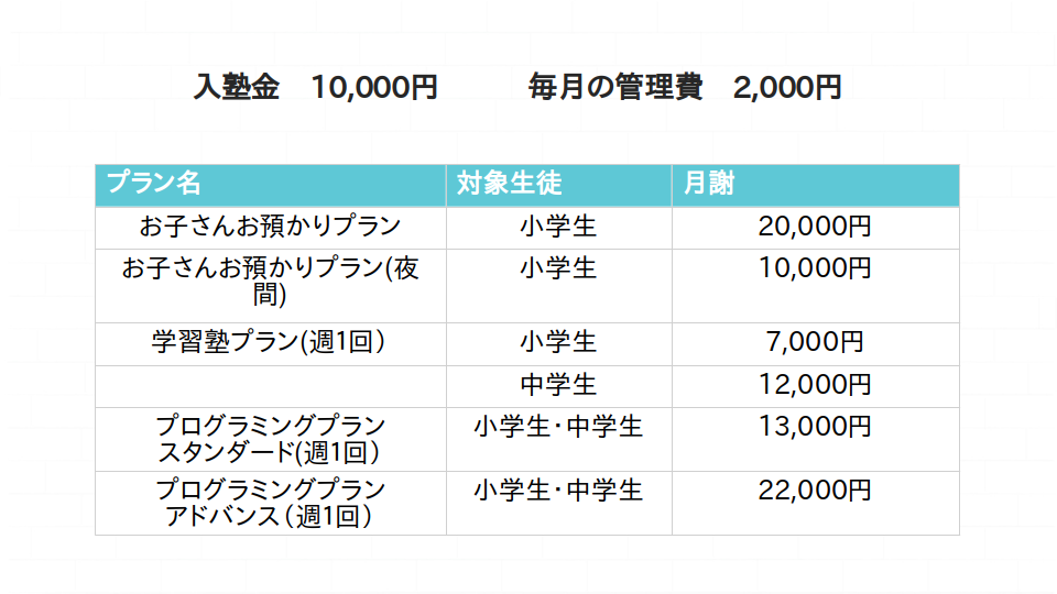 平日15時~18時まで、お子さんをお預かりさせて頂きます。 出入り自由なので、宿題を見て欲しい時のみ来て頂いても構いません。 (18時~20時までは夜間プランとして追加料金がかかります)